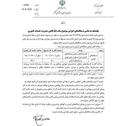 مصوبۀ هیئت دولت برای تغییر ساعتکاری دستگاههای اجرایی ابلاغ شد +مصوبه